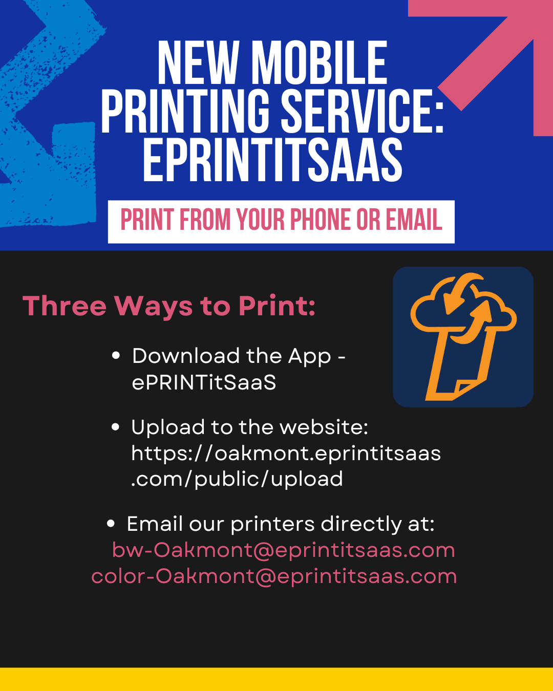 Introducing our new mobile printing service – ePRINTitSaas! This service allows you to print from your phone, your email, or your home computer – and come pick it up at our front desk. There are three ways to print: